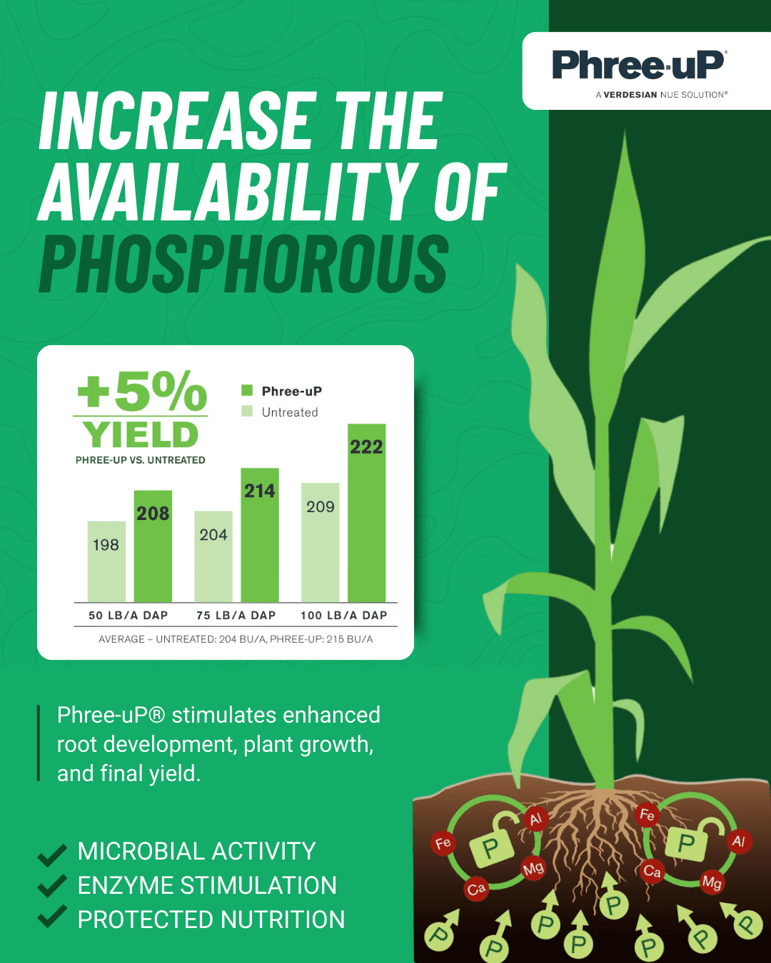 Phree-Up is a proprietary formulation that frees up tied-up phosphorus in the soil, making it plant-available. This enhances root development, promotes early growth, and supports more efficient use of applied phosphorus fertilizers.