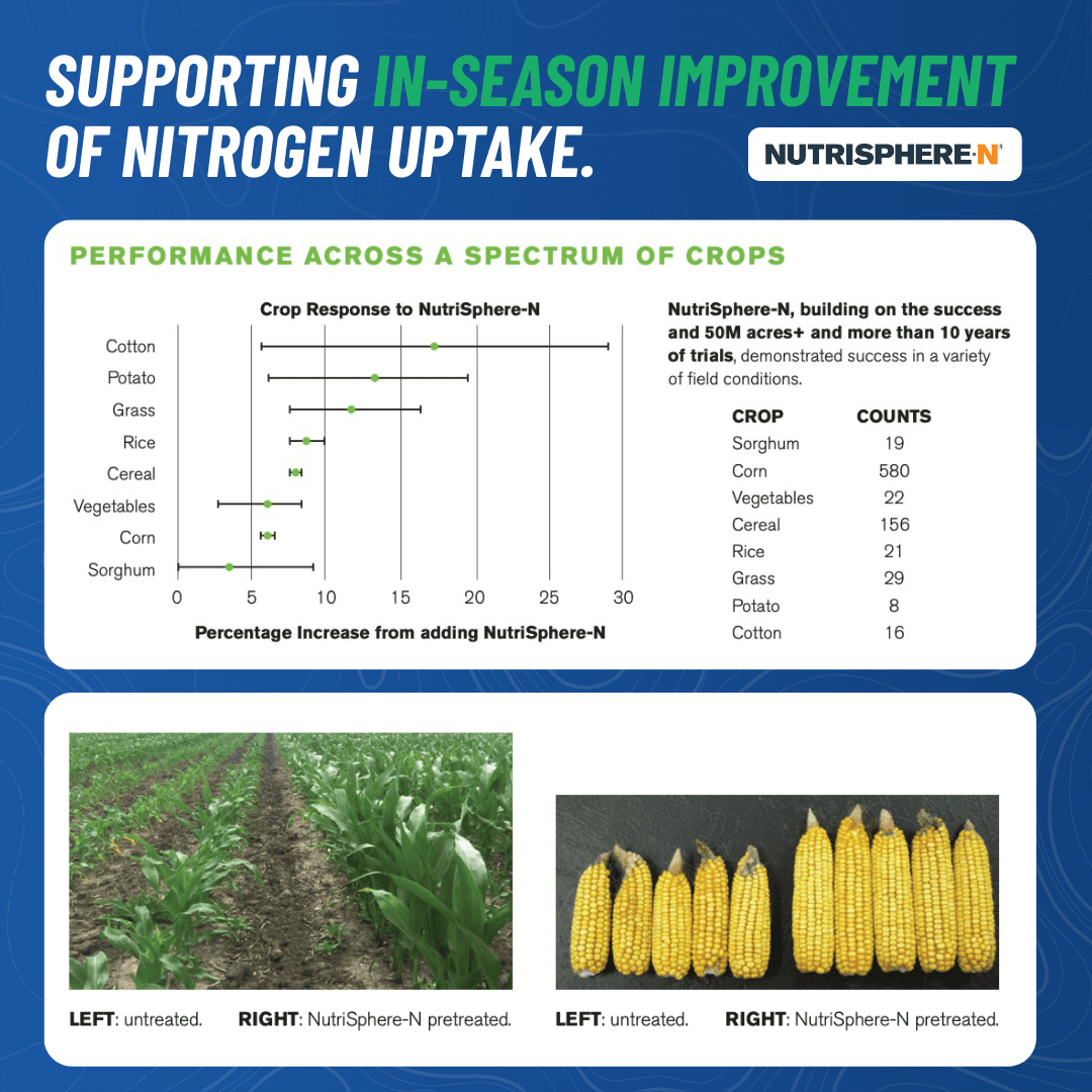 NutriSphere-N is a nitrogen stabilizer that protects your investment by keeping nitrogen in the ammonium form longer, reducing losses from leaching and volatilization. This ensures nitrogen stays in the root zone longer, where crops can use it.